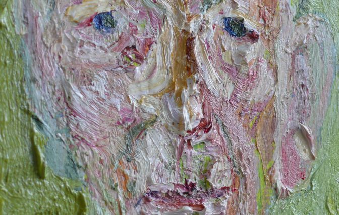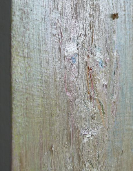 Car 1 maakte ik abstracter, door het gehele paneel met droge witte streken te bedekken. Zowel het gezicht als de achtergrond. De ondergrond er doorheen zichtbaar. Met wit en weinig kleur de trekken in het gelaat, nauwelijks zichtbaar. Op de detailfoto, hier onderaan, genomen met tegenlicht, worden de penseelstreken zichtbaar. Door de natte verf nog glanzend. Als dat droogt, krijgt dat dat brossige.