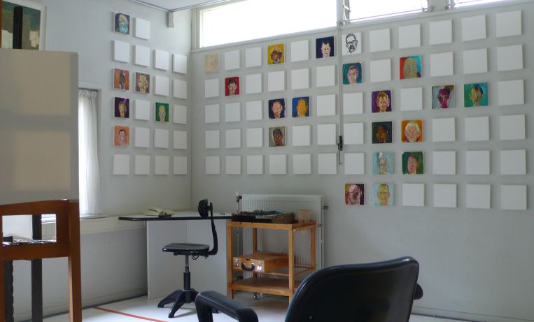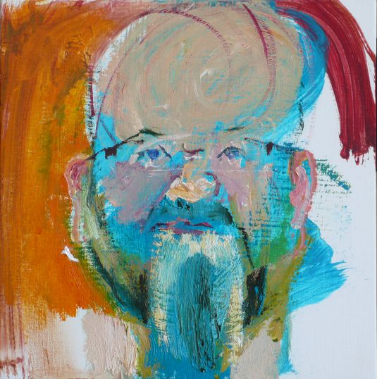 Van de eerste werkdag op 20 mei had ik nog twee onvoltooide portretten van Aps. De man die zo treffend een bij hem passend sterrenbeeld koos, de paradijsvogel (zie het bericht Zoekt mijn aangezicht van 28 mei, Geheimhouding en titels). Brillen schilderen vind ik altijd lastig. Doe ik iets met het montuur? Helemaal of alleen stukjes daarvan? Of kan ik wat met het vergrotende effect van de glazen op de ogen? Terwijl ik met wat tipjes het montuur aangaf en er iets over opmerkte, kwam Aps: